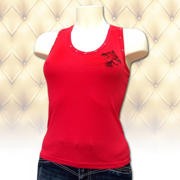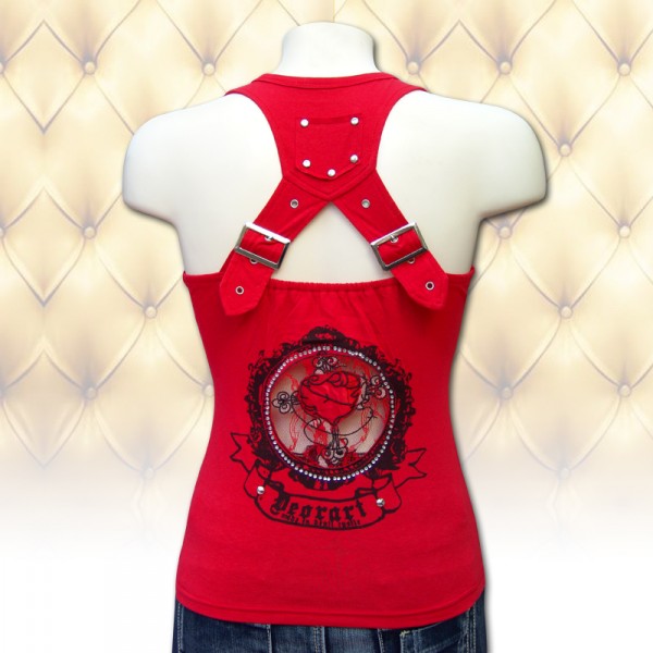 Sexy et original, ce top débardeur avec une rose noir brodée sur le coeur prend toute son originalité dans son dos : betelles à boucles métal réglables, broderies rappelant le motif du devant, dentelles noires laissant transparaître la peau et petits strass couleur cristal.