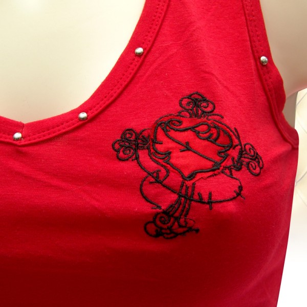 Top débardeur rouge avec rose noire brodée, bretelles et transparence