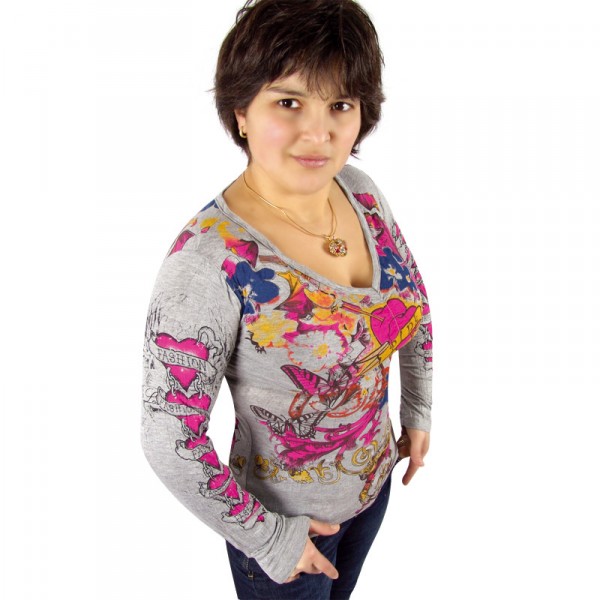 Top gris manches longues réalisé dans un tissu froissé. Magnifiques motifs sérigraphiés sur le devant, le dos et les manches.