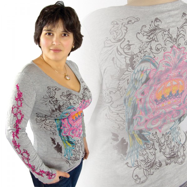 Magnifique top gris décolleté, en tissu froissé, réhaussé de superbes sérigraphies tendances sur les manches, le devant et dans le dos.