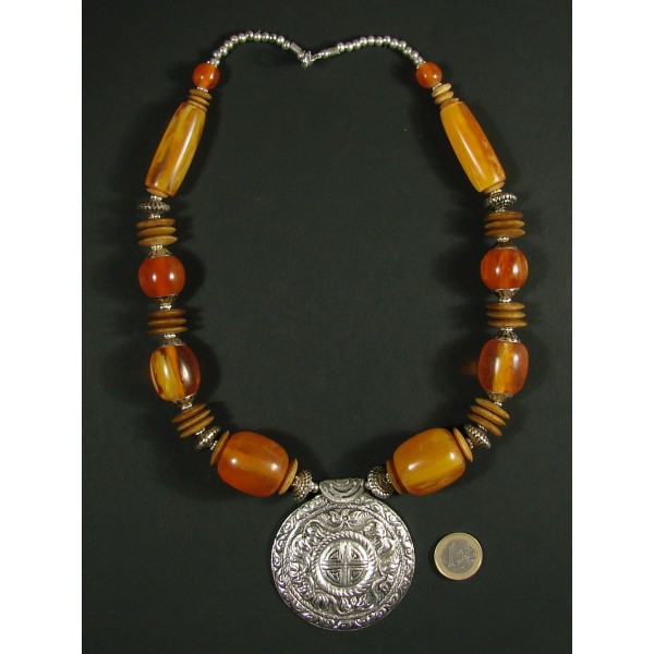Très belle réalisation d'inspiration orientale pour ce collier ethnique en perles oranges en pierre et pendentif métal ! Cet objet réalisé par des artisans sachant combiner les couleurs et les formes réhaussera vos tenues des plus classiques au plus sexy !