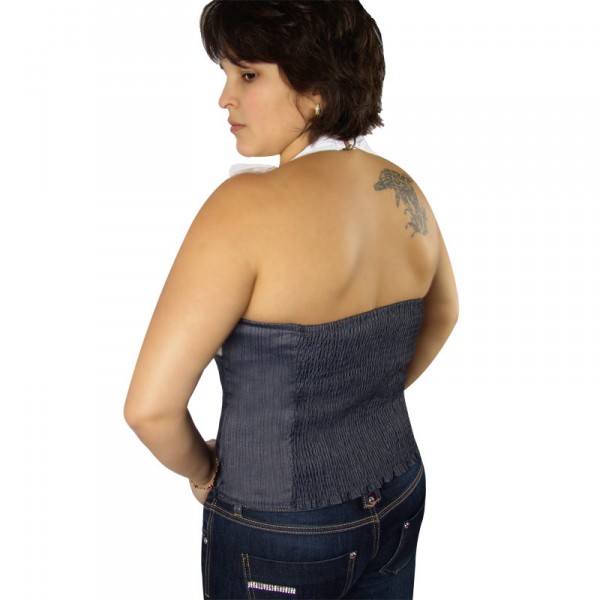 Magnifique top bleu et blanc, col tour du cou, superbe décolleté plongeant que vous règlerez à votre guise grâce au lacet, deux sangles fantaisies pour parfaire votre silhouette. Dos nu. Fermeture zip discret sur le côté.